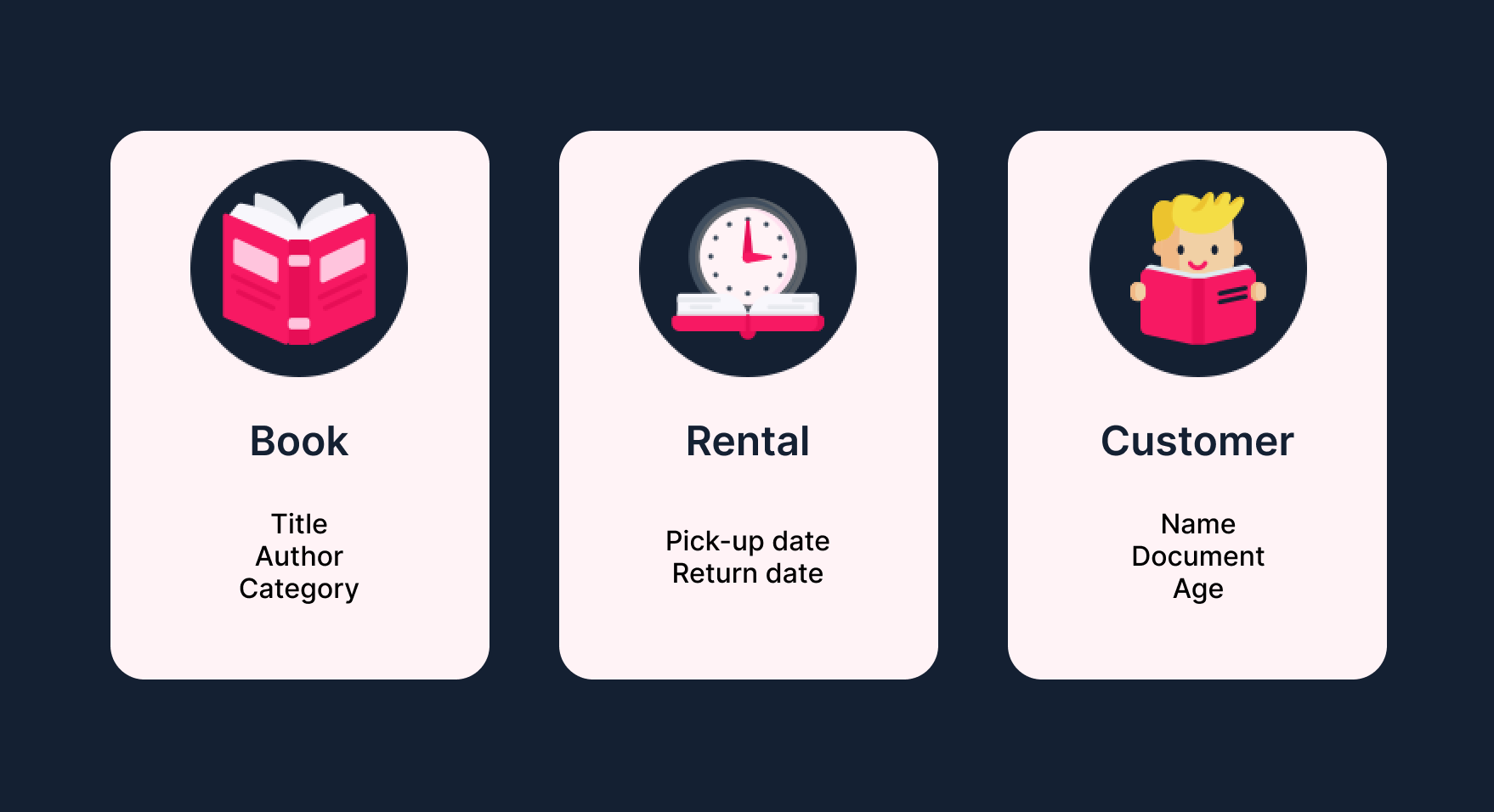 For example, imagine a system that controls a library. This system controls books that customers can borrow. Thus, we can notice that these three concepts (book, customer, borrowing) are entities that contain information about each one.