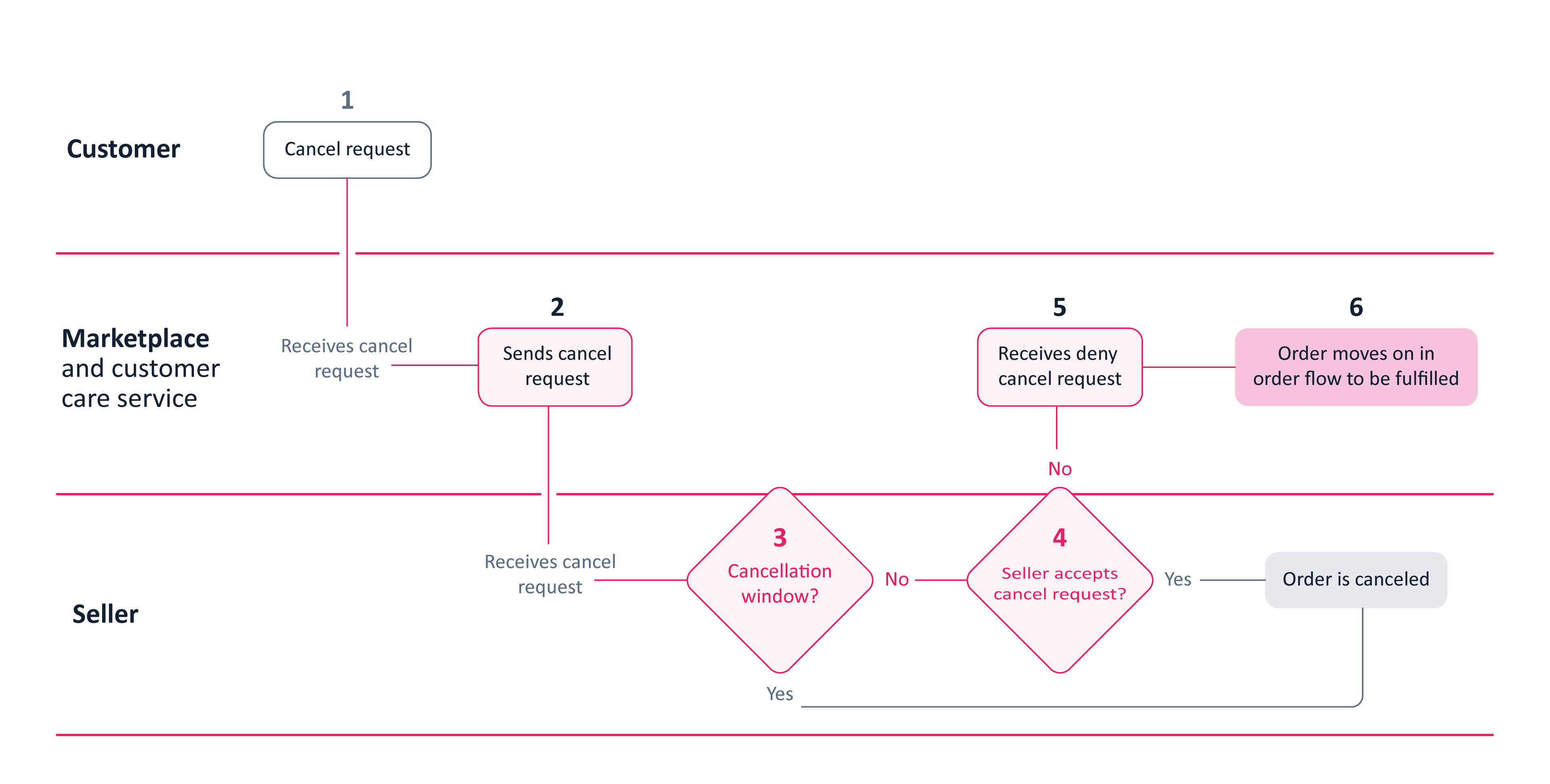 The order flow has a cancellation window – or grace period – in which the customer can automatically cancel an order. Except for that period, the seller can decline an order cancellation request, regardless of whether the customer or the marketplace initiated it.