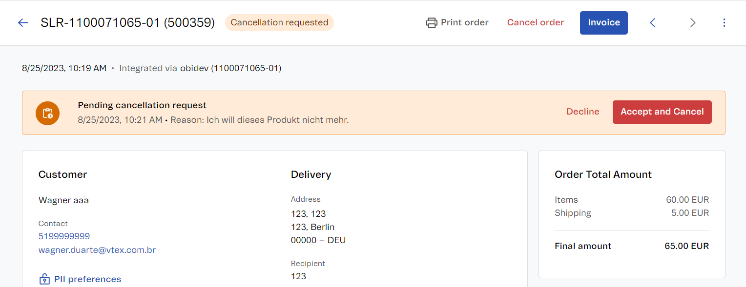 If within 30 days the seller takes no action regarding a cancellation order request, the order is automatically canceled by the VTEX platform.
