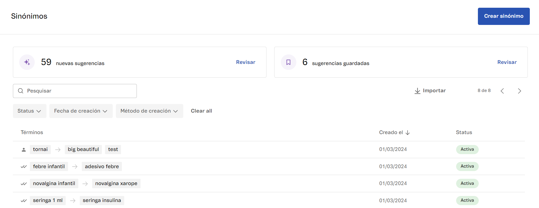 With the Intelligent Synonyms feature, the Synonyms page in the VTEX Admin provides intelligent recommendations of terms, as well as manual configuration of synonyms. The platform leverages artificial intelligence to suggest synonyms based on customer search behavior in your store.