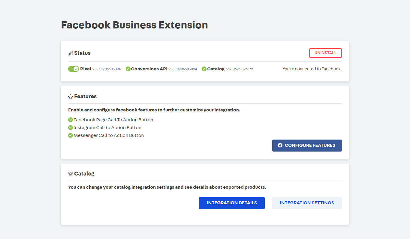 This is the section where you can view the status of your connection with Facebook, as well as the Facebook Pixel ID and Catalog ID. There is also an Uninstall button.