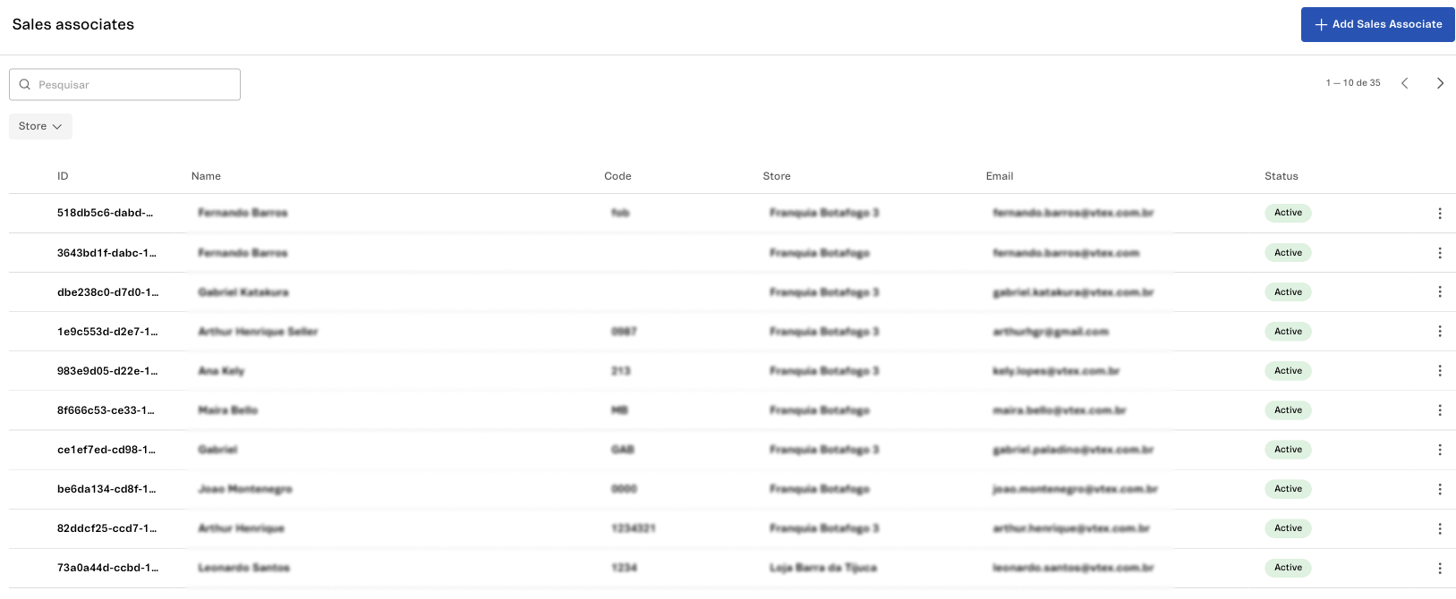 After configuring the VTEX Sales App basic settings, you can add sales associates to the system or manage the existing ones in the VTEX Admin. On the VTEX Admin Store Settings page, there is a Sales associates category that displays a list of the sales associates added to your VTEX Sales App. It allows you to manage sales associate information across all franchise accounts of your store, enabling you to add, search, filter, edit, and inactivate them.