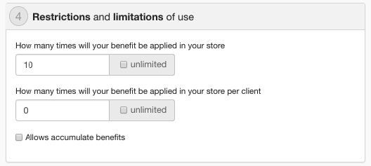 If you want regular promotion to be applied only for a limited number of times, simply uncheck the unlimited option in restrictions and limitations of use. After that, a field becomes available, to register the number of times the promotion can be applied to purchases in your store. So, if you register the number 10, the promotion will only be granted to the first 10 completed orders that meet the rules of the promotion in your store.