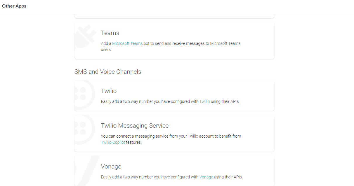 After selecting your SMS channel, follow the step-by-step guide to complete the integration. Here are the SMS channels available in the project.