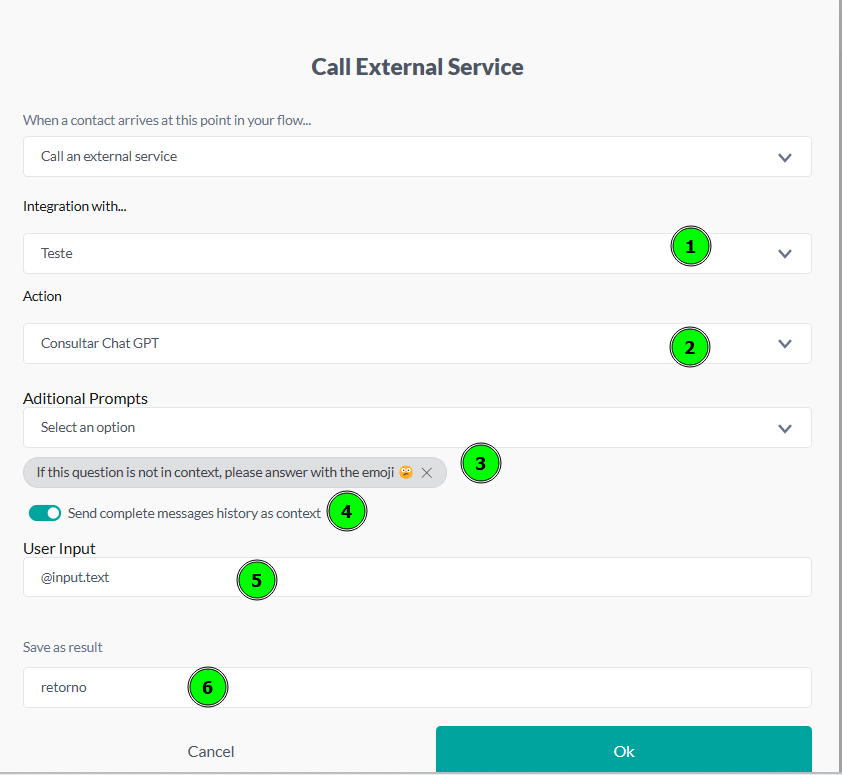 - Set a name to save the result of your ChatGPT integration card. This name will be used later in the expression that will consume the response generated by the intelligence: @results.return.extra.choices.0.message.content