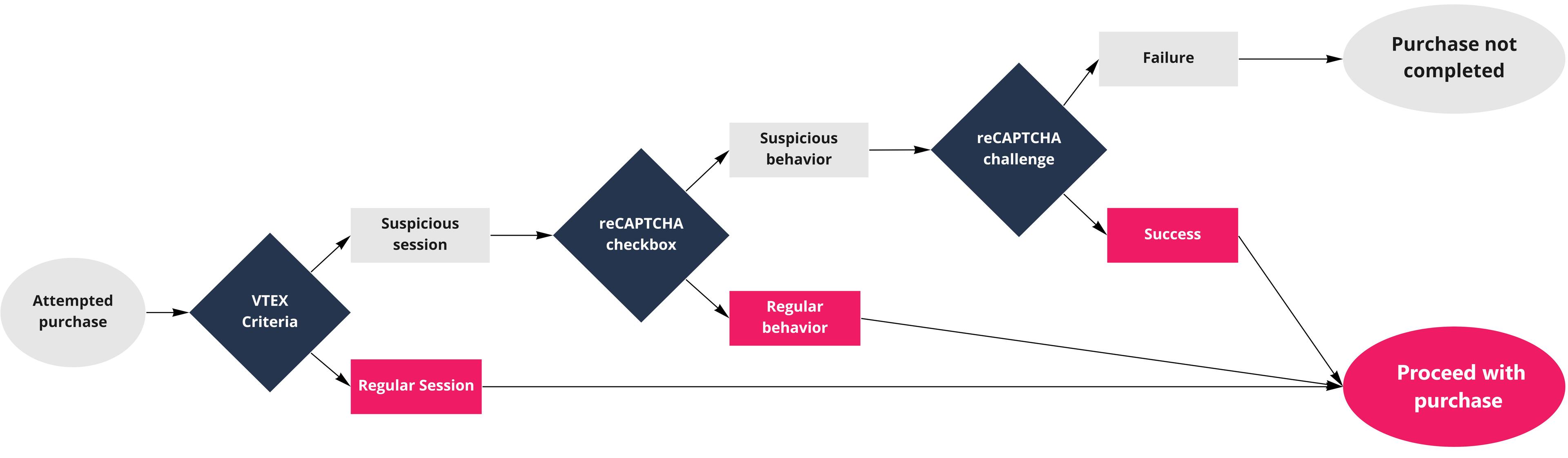 VTEX recommends the VTEX criteria option. An algorithm will be applied to decide the need for the reCAPTCHA challenge. It is maintained by VTEX and is more or less comprehensive according to the behavior patterns observed.