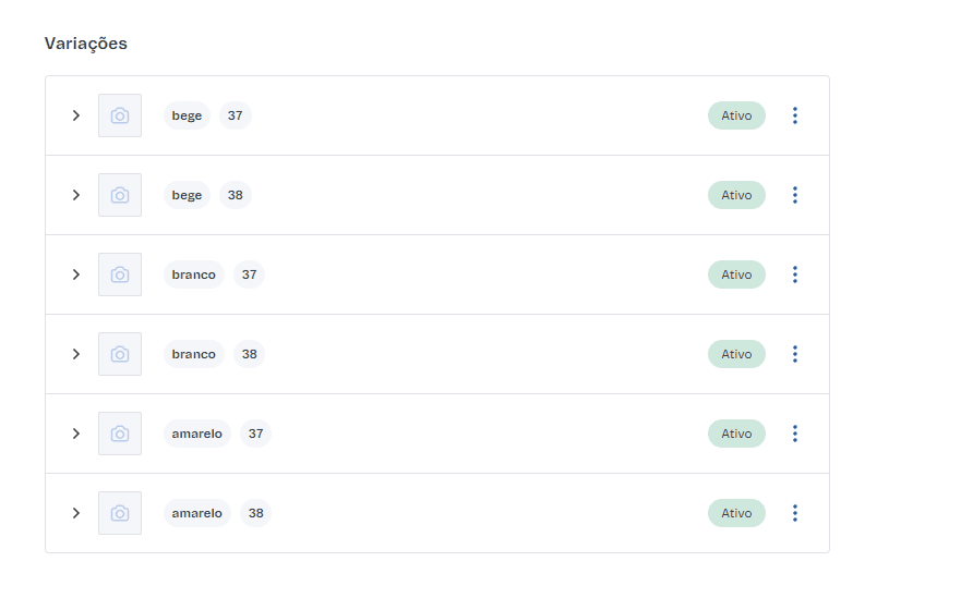 Além disso, a partir da combinação das opções criadas, a lista de SKUs possíveis é gerada automaticamente e exibida na seção Variações.