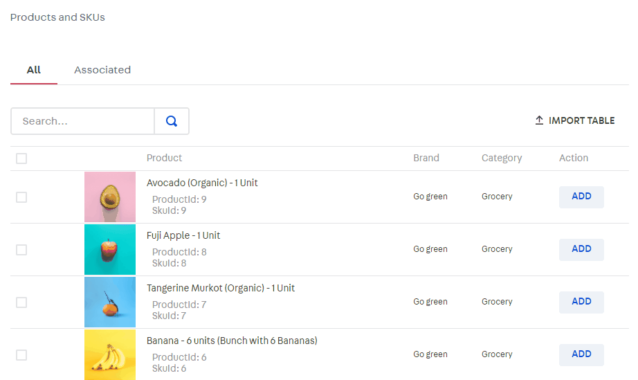 The Associated Products tab displays a list of all Products and SKUs in your store and allows you to select the ones you want to associate with the subscription plan. On this tab, you can navigate between the categories All and Associated.