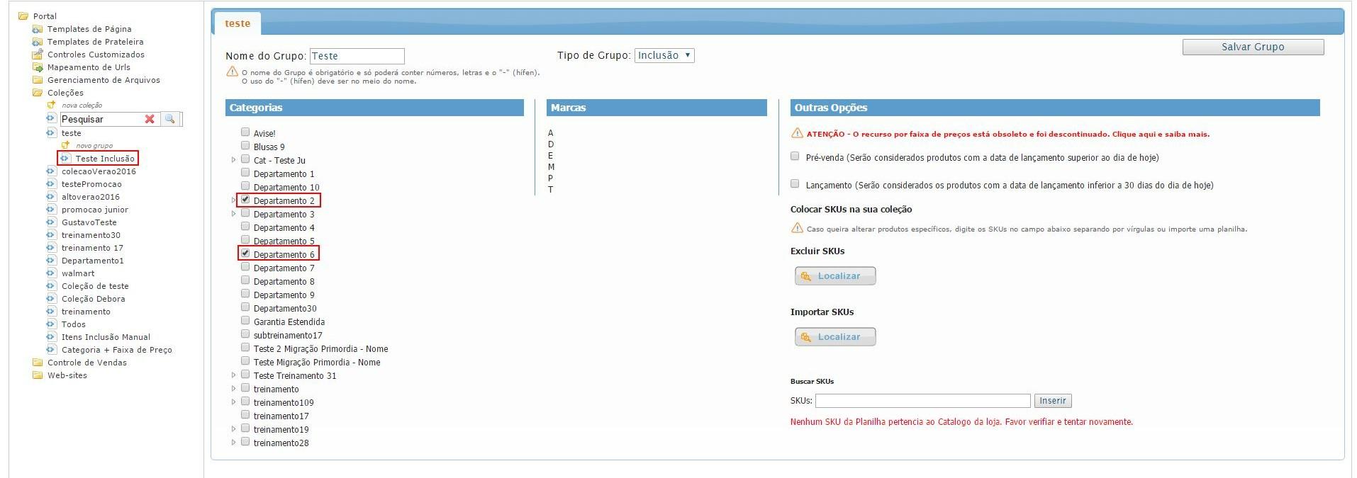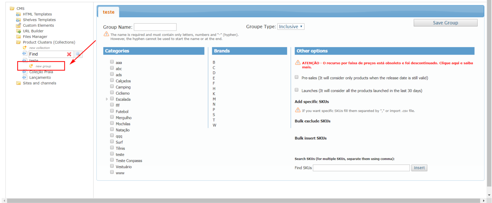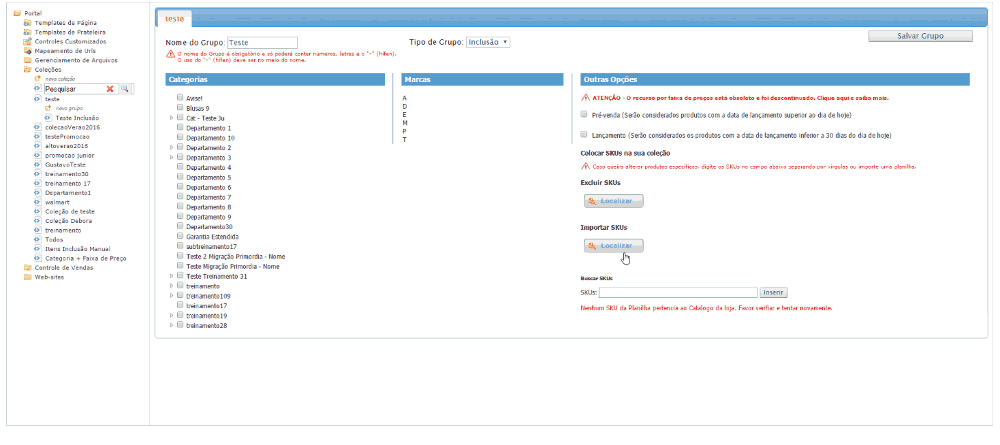 Unlike the previous version, where specific products were included using the Product ID, in the new module the manual inclusions are done using the SKU of a product. In the corresponding field, it is possible to type in the ID of one or several SKUs, separating the values with commas. E.g.: 2000004,2000009,2000005. In spite of the difference in the manner of registration, in practice the effect will be the same, since by associating an SKU with a group, the "father" product of that SKU will also be added to the collection. Where a product has more than one SKU, just add one of the SKUs to the group, and all associated SKUs will be included in it. The field for including the IDs does not permit the typing of alphanumerical characters or the use of combinations of the keys Control + C and Control + V. Also, when the number of SKUs on the list exceeds 10 items, a pagination control will become available. To exclude an SKU from the list, just click on the red button beside the corresponding SKU.