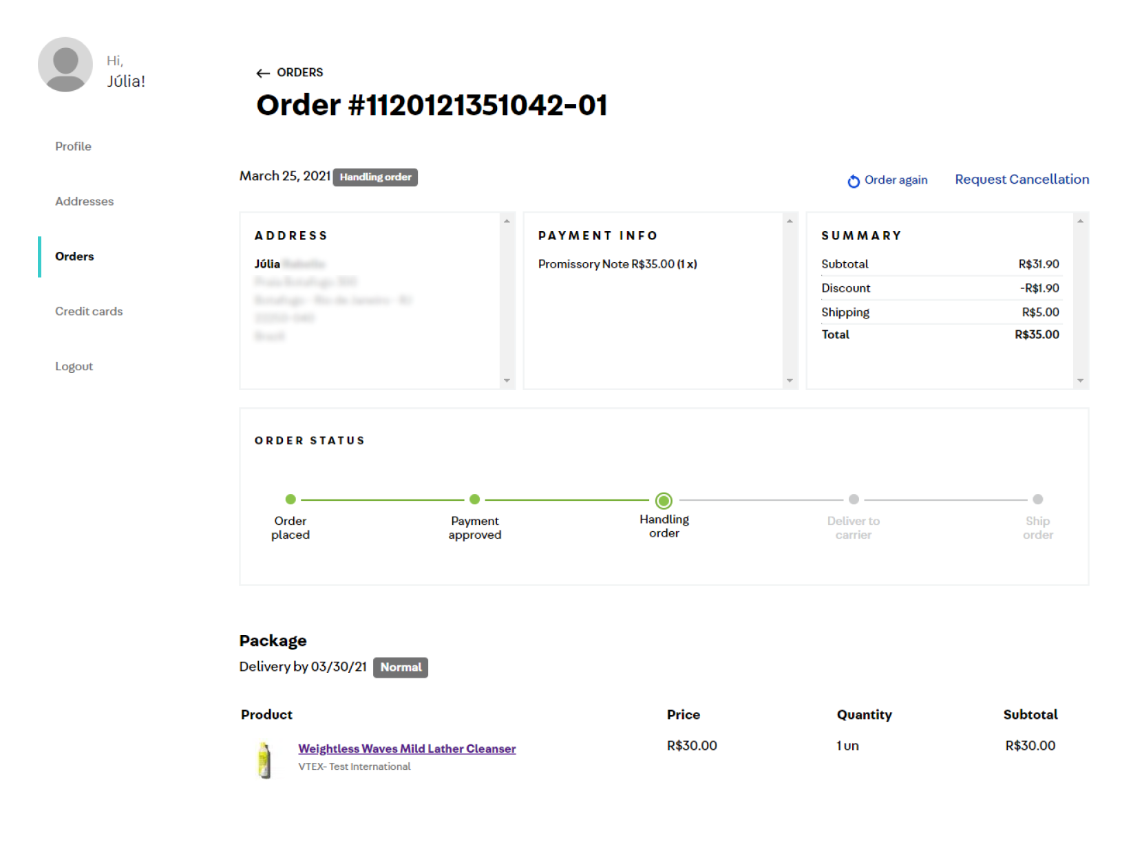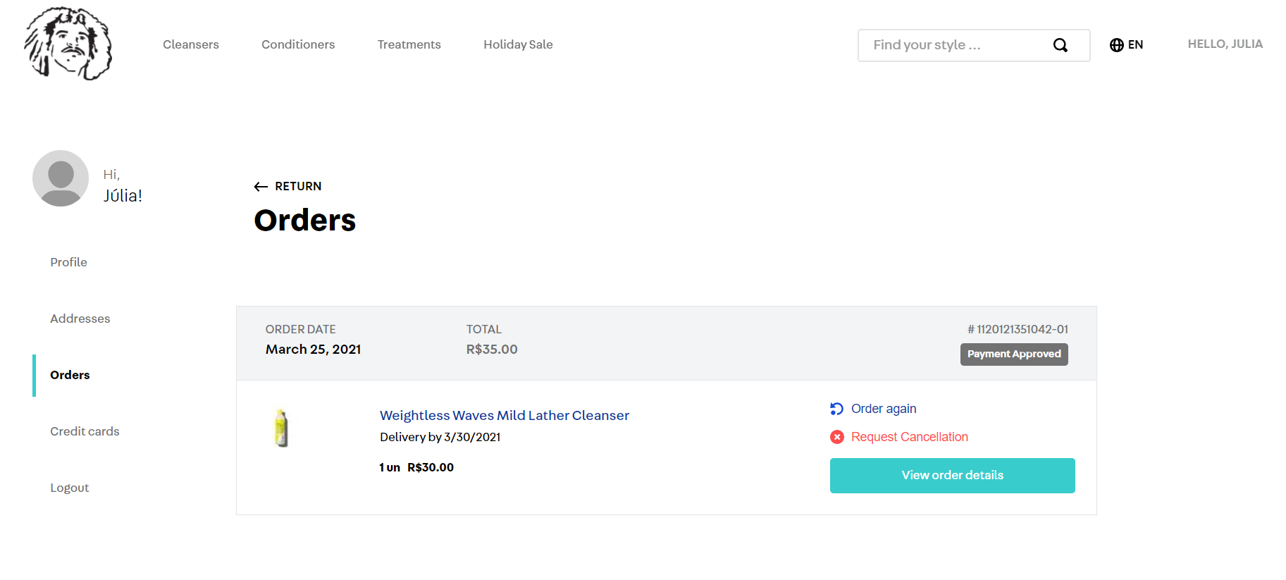 The My Account page offers your customers autonomy to manage their orders and personal data on a single page. This feature facilitates the operation of your business by reducing operational costs associated with customer service.
