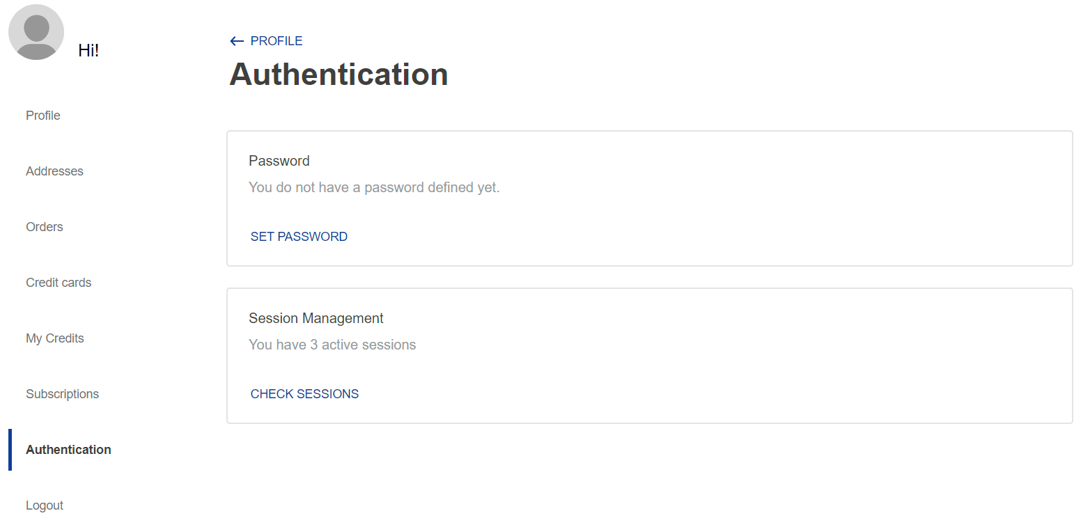 This section can be accessed on the left side menu by clicking on Authentication in the user profile settings. It offers options for password and session management.