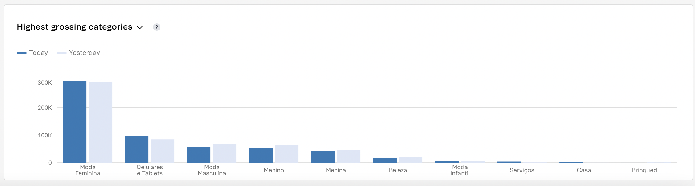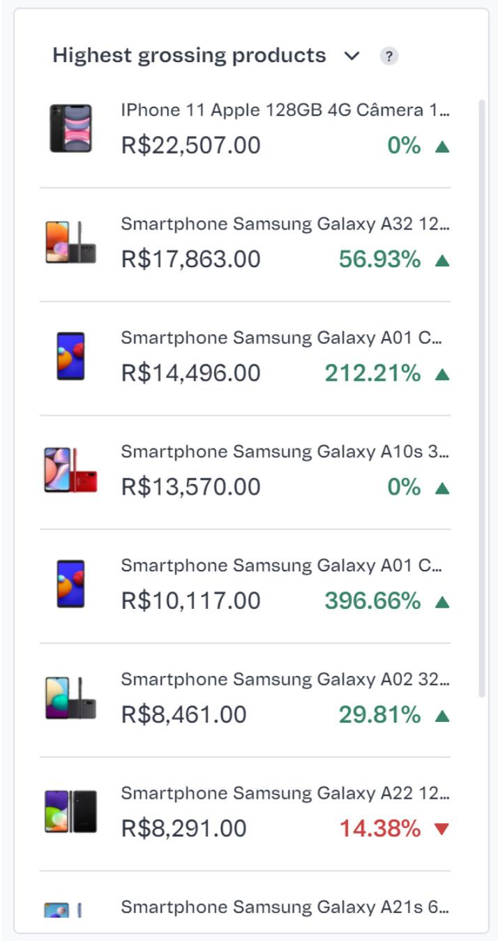 - Highest grossing products: the products that generated the highest revenue in the selected period. This list shows the amount received as revenue, and a percentage indicating the increase or decrease in revenue, comparing the selected periods.