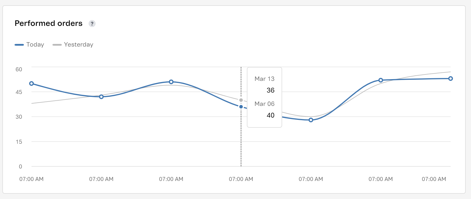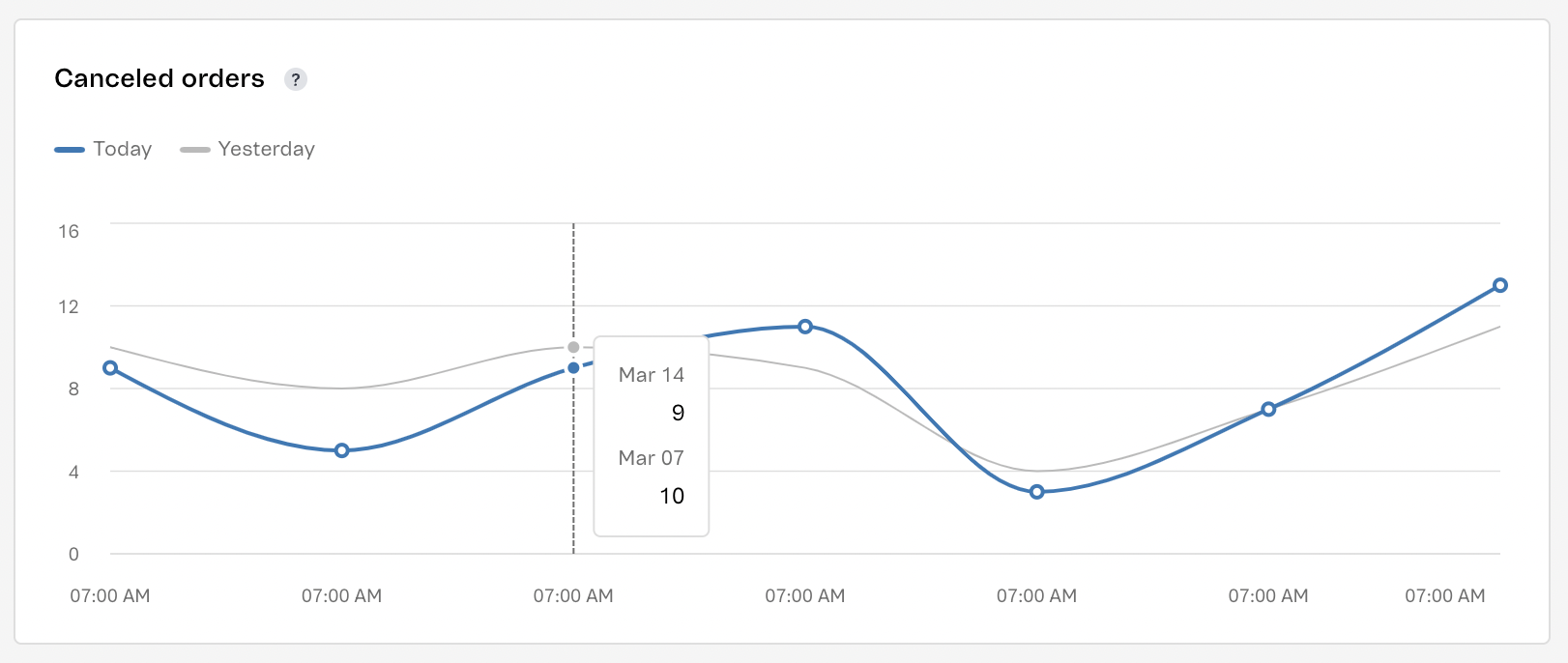 This chart displays the number of orders that were received by your store in the selected period. The thick blue line represents the orders placed in the more recent period. The thin gray line represents the orders placed in the period selected for comparison. By hovering the mouse over the chart, the number of orders captured at a specific time is displayed.