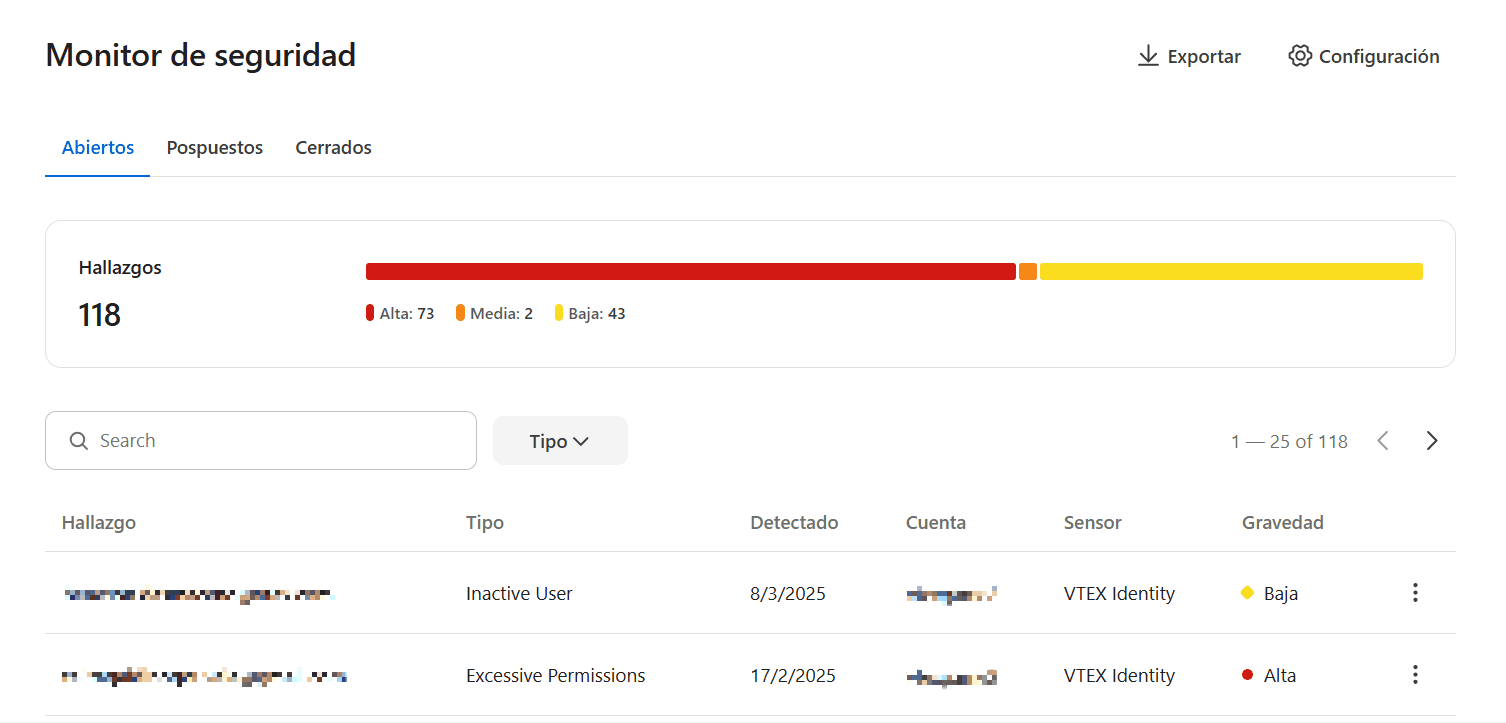 Agregamos la opción de exportar hallazgos directamente desde el dashboard de Security Monitor. Ahora, puedes generar un archivo CSV con los hallazgos mostrados en la interfaz, facilitando el uso y análisis de esta información fuera de la plataforma VTEX. Sigue los pasos a continuación: