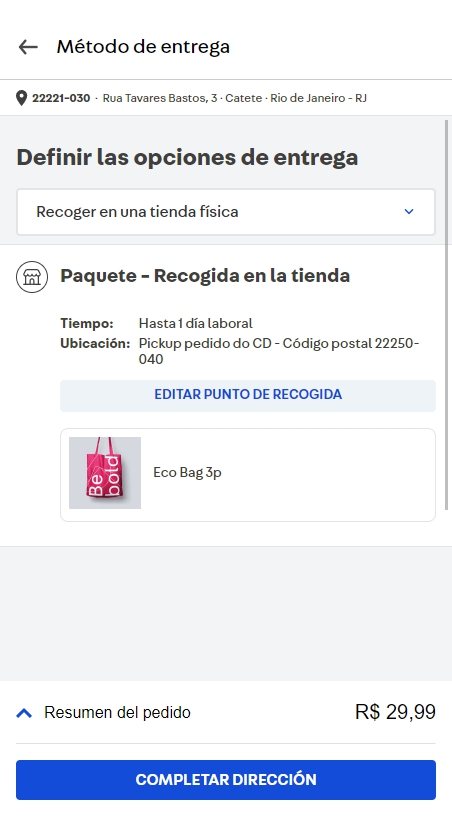 Para los puntos de recogida, el sistema selecciona las tiendas que tienen los SKUs en stock y muestra la tienda más cercana al código postal del cliente, como sugerencia. Si el vendedor quiere cambiar la tienda donde el cliente recogerá los productos, solo hay que hacer clic en el botón Editar punto de recogida.