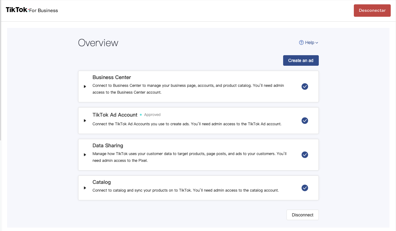 Después de la desconexión, puedes volver a conectar la integración en cualquier momento volviendo a realizar los pasos descritos en el link Configuración de la integración con TikTok for Business.