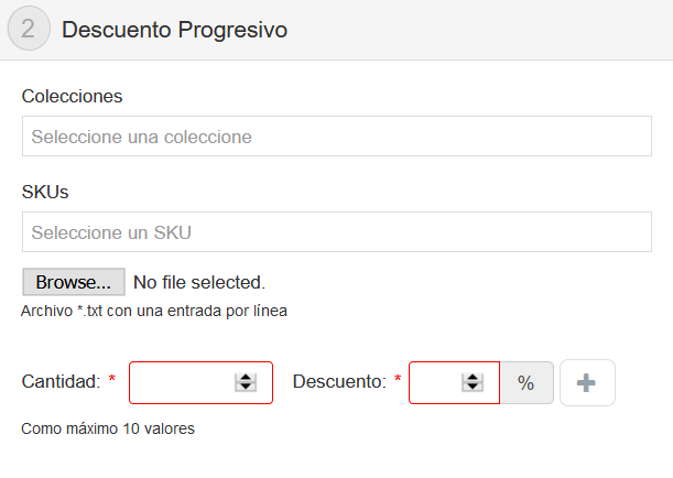 Al configurar la promoción de Descuento Progresivo, la tienda debe definir a qué colecciones o SKUs se aplicará. Luego, elija la primera cantidad y el primer descuento aplicado. Por ejemplo: para los primeros 3 ítems, el cliente recibirá un descuento del 5%.
