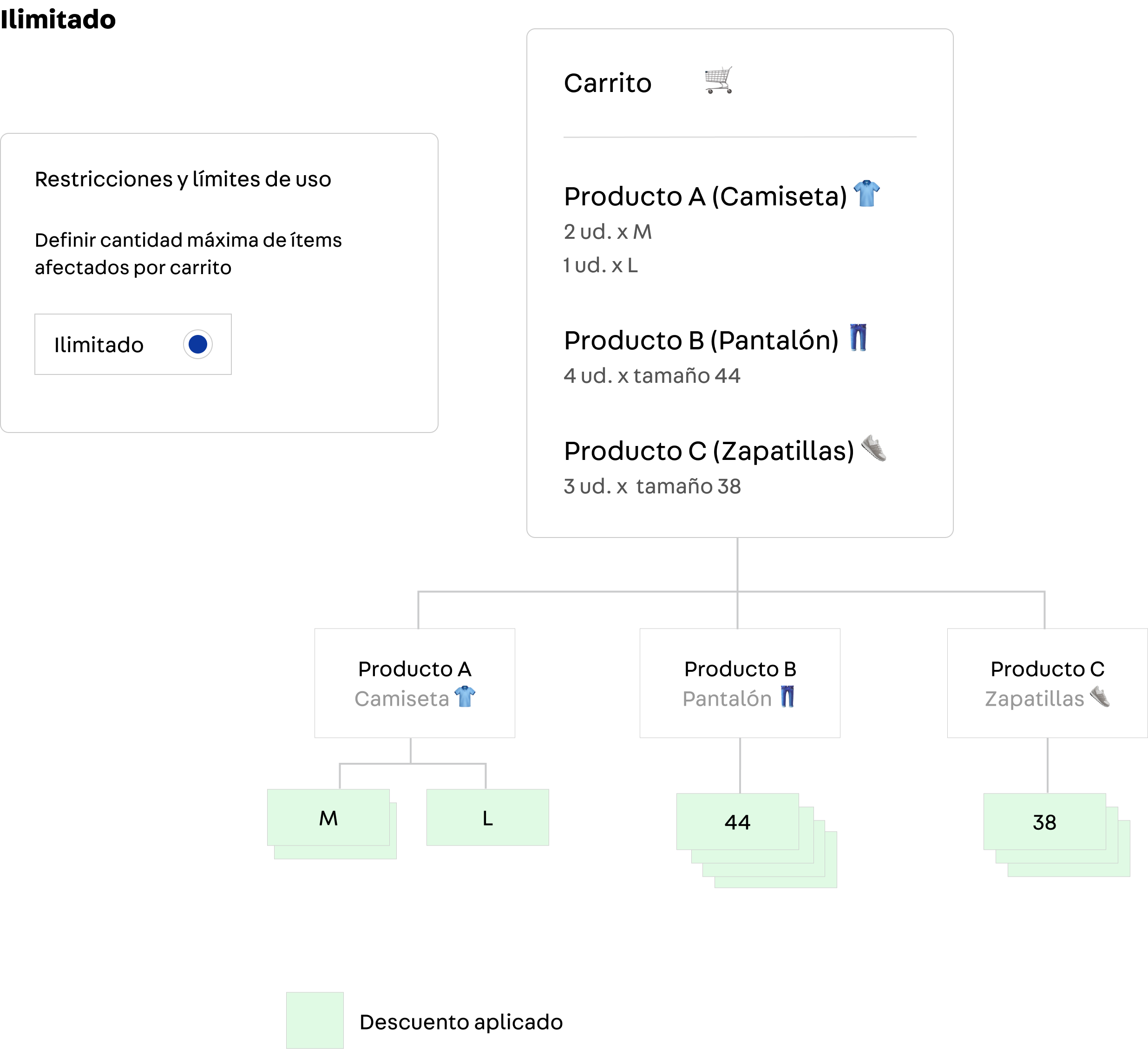 Por defecto, la opción ilimitado está activa, aplicando la promoción a todos los ítems del carrito, como se ilustra en el siguiente diagrama: