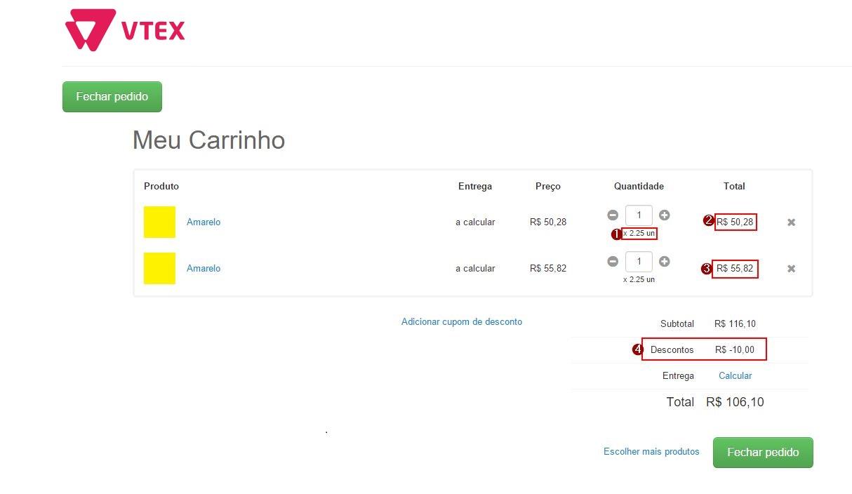 Pero hay escenarios en que el importe de descuento es indivisible por el número de artículos, especialmente en los casos en que el SKU tiene una unidad de multiplicación, por lo que necesitamos dar diferentes descuentos para los artículos del mismo SKU, de manera que el importe de descuento sea correcto. Lo que termina dejando los precios diferentes y separando cada unidad en una fila. Vea mejor esta explicación con el siguiente ejemplo.