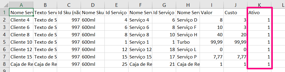 - Ir a la UI https://account.myvtex.com/admin/Site/SkuVincularValorServico.aspx cambiando las filas de la hoja adjunta de 0 a 1 y viceversa:
