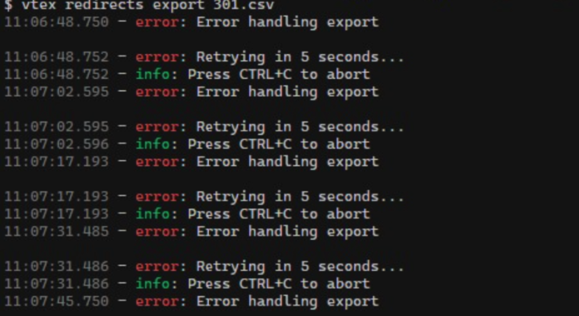 Después de crear redirecciones erróneas que contienen caracteres que no deben ser subidos: ie.: #, consultas, o redirecciones que deberían ser creadas a nivel de servidor, la carga/descarga masiva del csv a través del CLI ya no funciona.