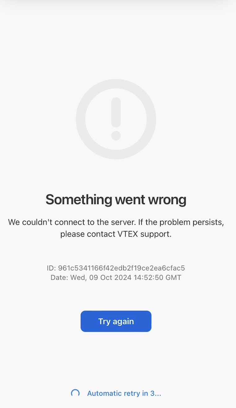 Intenta acceder a algunas páginas en el admin, por ejemplo, de una cuenta, y aleatoriamente, esta página puede recibir el error de abajo. Esta imagen también puede aparecer en el entorno myvtex al acceder a cualquier otra página:
