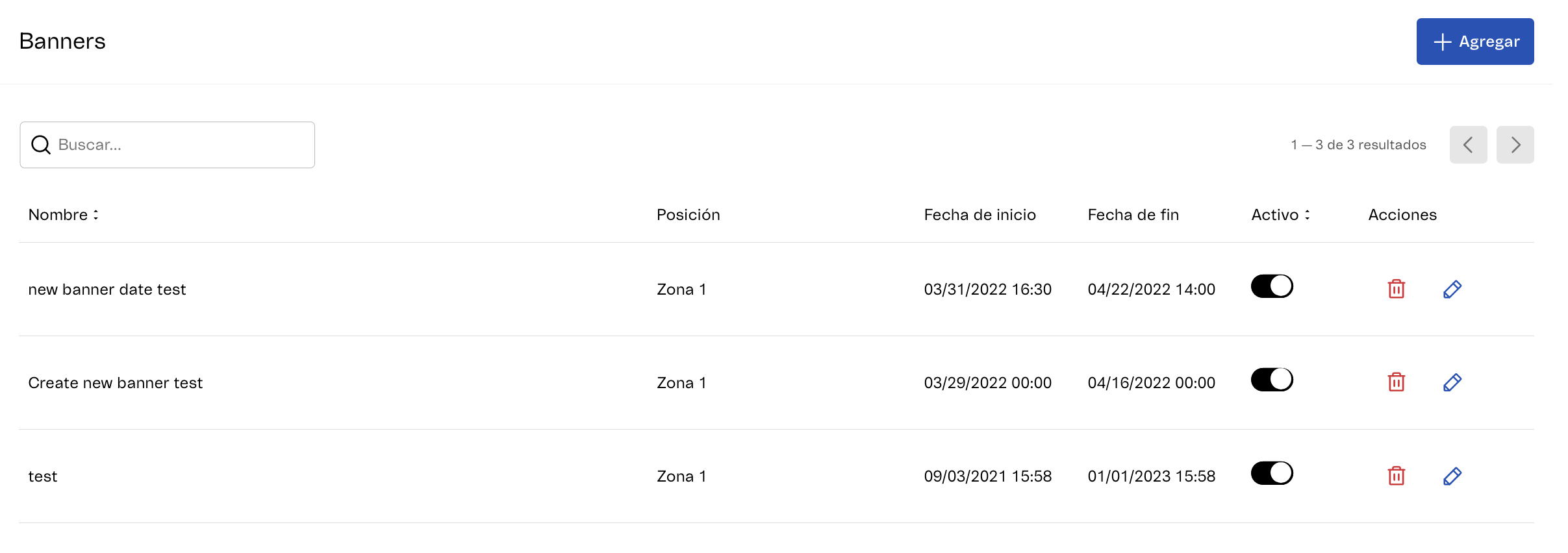 En VTEX Admin, la página Storefront > Banners muestra la lista completa de banners registrados y permite realizar las siguientes acciones: