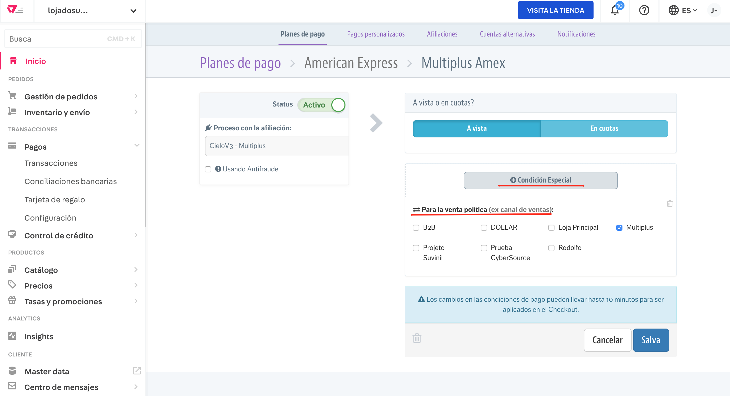 Las condiciones de pago poseen un caché de hasta 10 minutos en el Smart Checkout. Luego, cualquier cambio en las Condiciones de Pago del modulo Pagos puede llevar hasta 10 minutos para entrar en producción en el Smart Checkout.