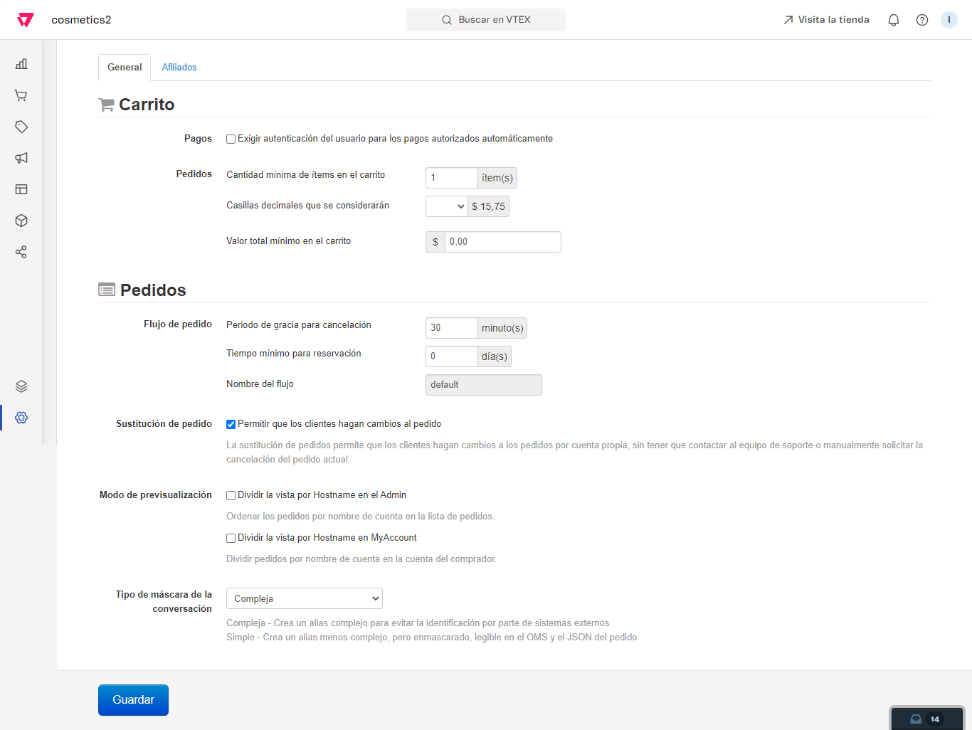 - Cantidad mínima de ítems en el carrito: Estándar: 1 ítem. Esto impedirá que el cliente cierre la compra sin tener al menos el valor en cantidad de ítems igual al definido en este campo.