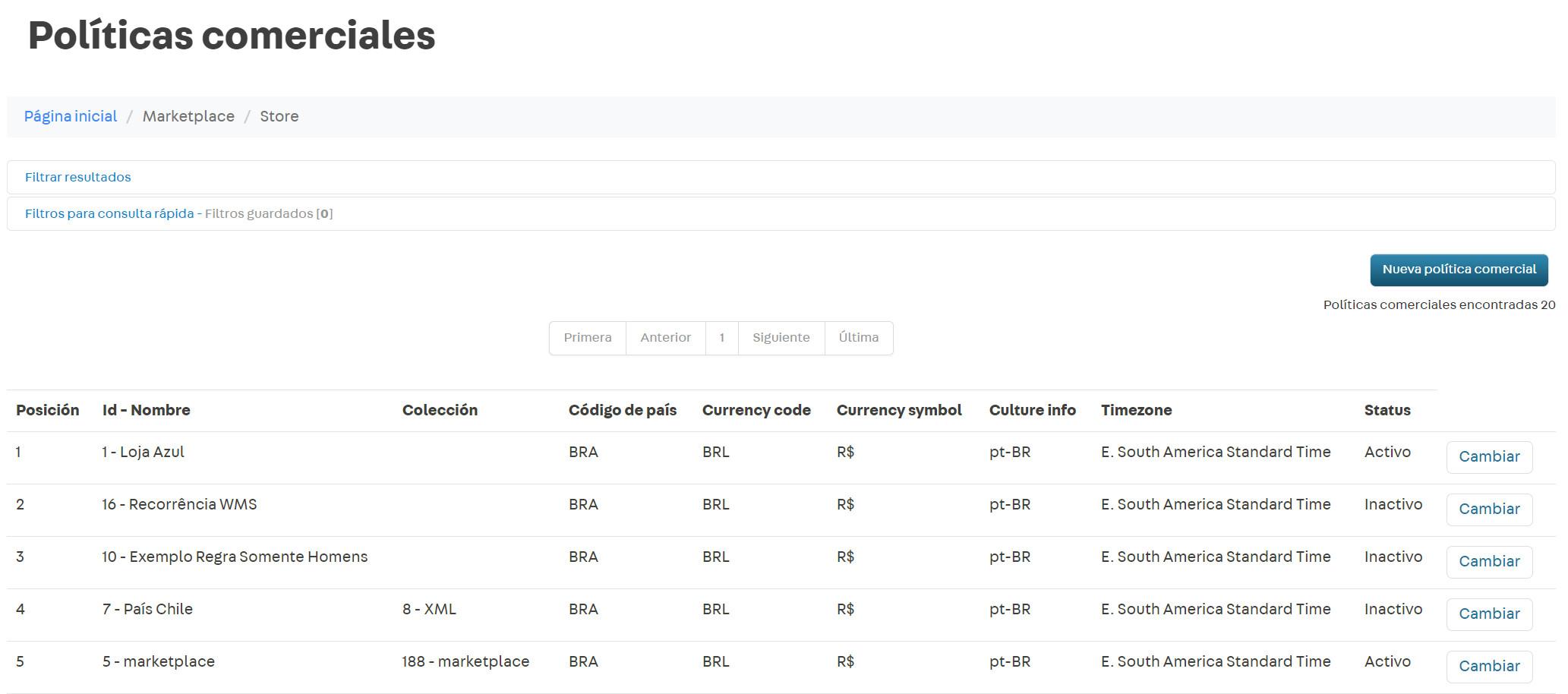 Esta configuración se realiza en el módulo «Configuración de la tienda», en la página «Políticas comerciales». Debe crear una nueva política comercial cuando la configuración de catálogo, precios, promociones, logística y pagos sean diferentes entre los marketplaces en que los sellers venden sus productos.