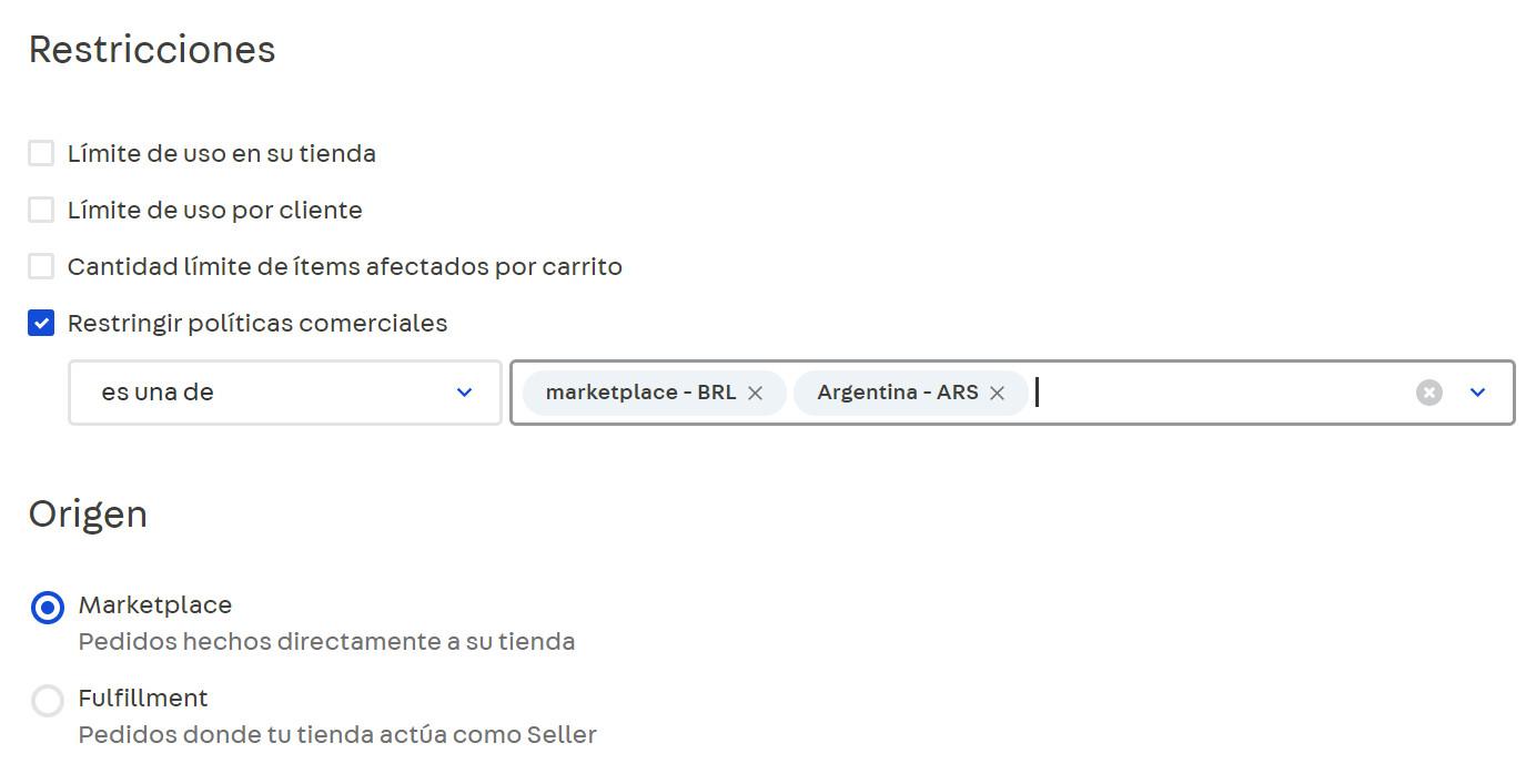 Los sellers pueden crear promociones con diferentes condiciones para los marketplaces en los que venden productos. Al crear una promoción, las políticas comerciales indican en qué marketplaces se aplicarán. Si desea crear una promoción para su tienda en un marketplace que ofrece una comisión más baja para sus productos, debe indicar la política comercial en la que se aplicará la promoción.