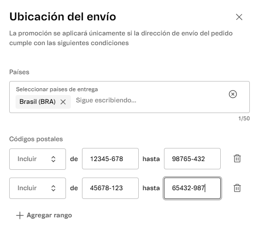 - Código postal de entrega: permite configurar rangos de códigos postales para limitar la aplicación de la promoción a regiones específicas.
