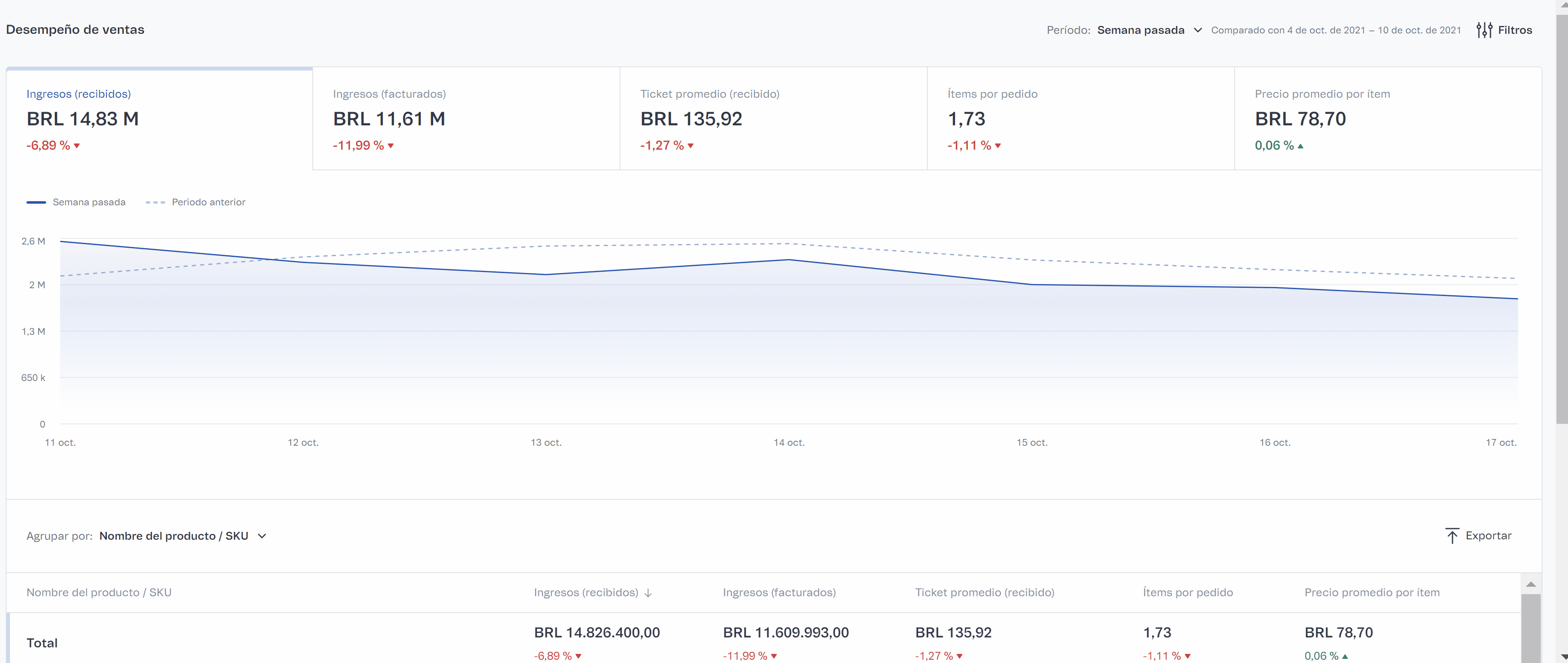 Los datos de la página proceden del sistema de Gestión de pedidos de VTEX. El Desempeño de Ventas es una solución analítica, que utiliza heurística y fórmulas creadas a partir de nuestra experiencia, llevando a nuestros clientes de ecommerce al siguiente nivel para calcular sus métricas. La página no debe utilizarse como un sustituto de los datos del OMS, sino como una herramienta de análisis y de insights de negocio.