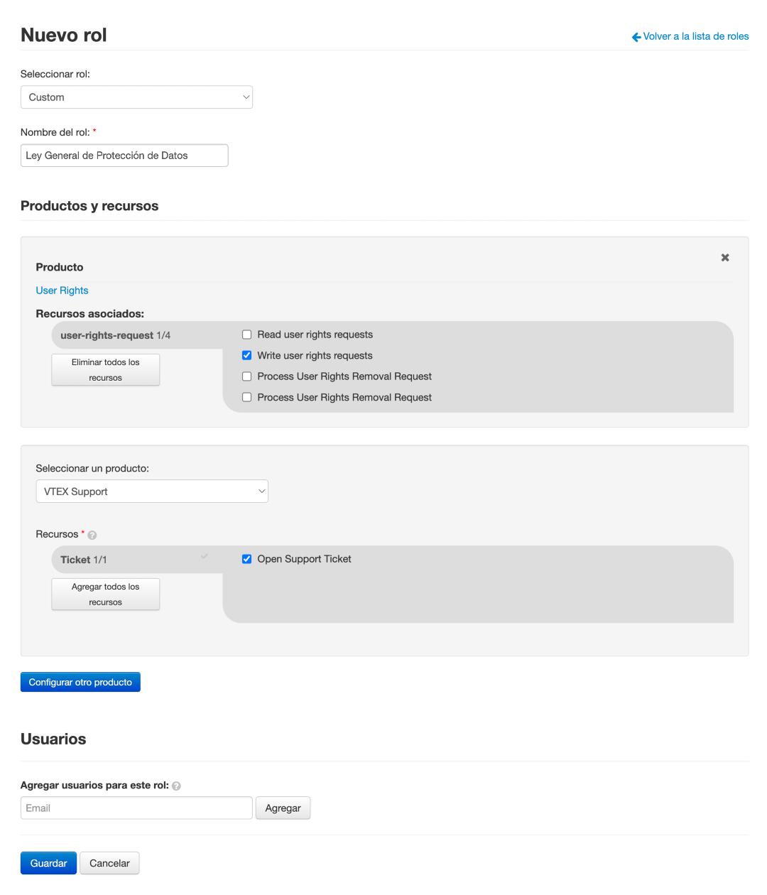 Para solicitar la eliminación de datos, crea un rol personalizado llamado Ley General de Protección de Datos con los siguientes recursos de License Manager: