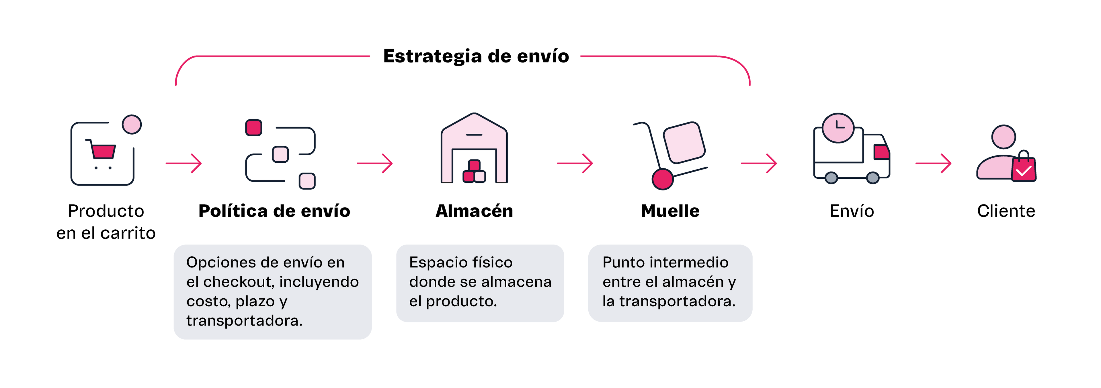 Estrategia de envío es la relación entre stock, muelle y política de envío; es decir, la forma en que se comunican el stock, el muelle y la política de envío definirá la coordinación de la estructura de entrega de los pedidos de la tienda.