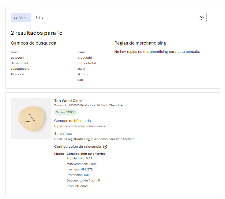 • Configuraciones y reglas de búsqueda (configurados en VTEX Intelligent Search).