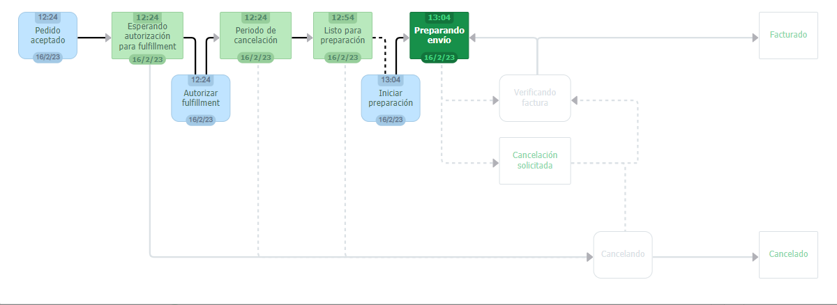 El flujo de pedidos describe los status, posibilidades y acciones a lo largo del ciclo de vida de un pedido. Con el flujo, el administrador de la tienda también da seguimiento a las etapas del pedido mapeadas en la plataforma (status).