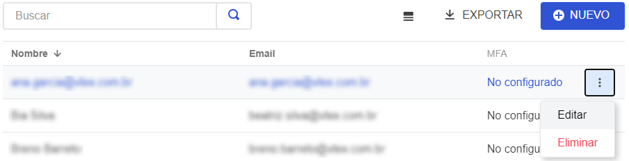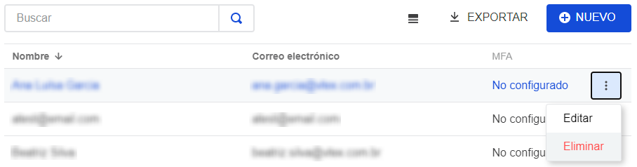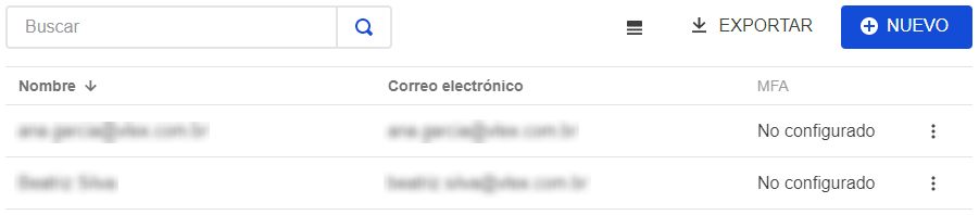 En esta sección, se mostrará la lista de usuarios con sus respectivos Nombre, Email y configuración de MFA. También pueden verse las presentes opciones de búsqueda, exportación y creación de nuevos usuarios, así como editar y eliminar usuarios.