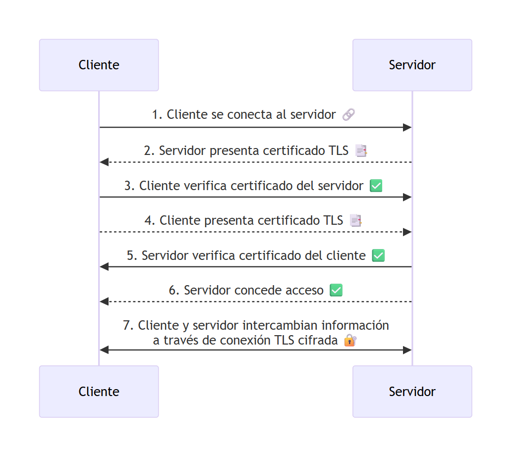 Autenticación mutua: el cliente y el servidor verifican la identidad del otro antes de intercambiar cualquier dato, lo que impide accesos no autorizados.