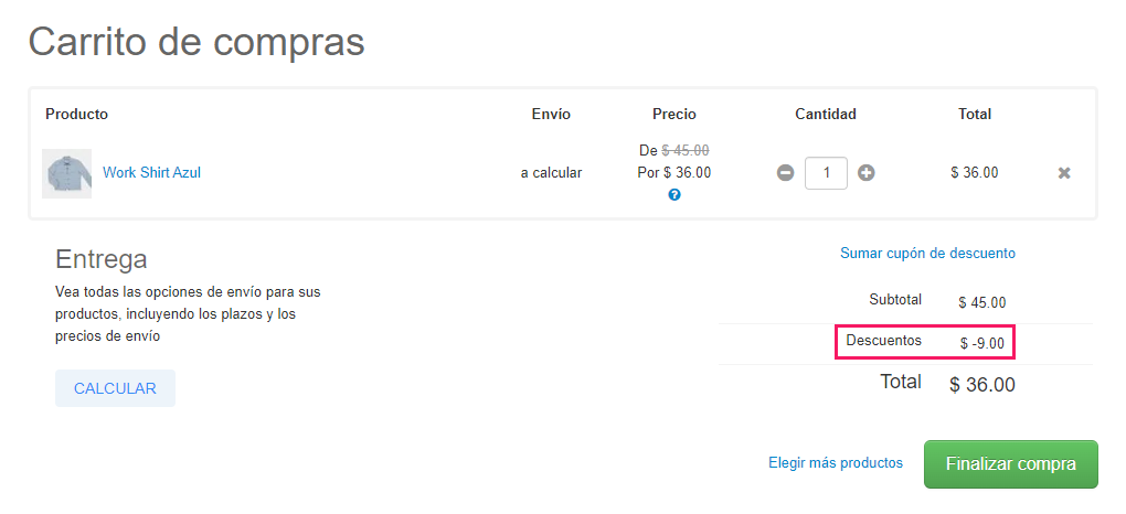 De esta manera, la promoción aplicará el valor de descuento más bajo en cada caso y comparará el cálculo del 20% del total con el valor límite de $ 10. En los escenarios que se muestran a continuación, podrás ver la aplicación práctica de esta promoción.