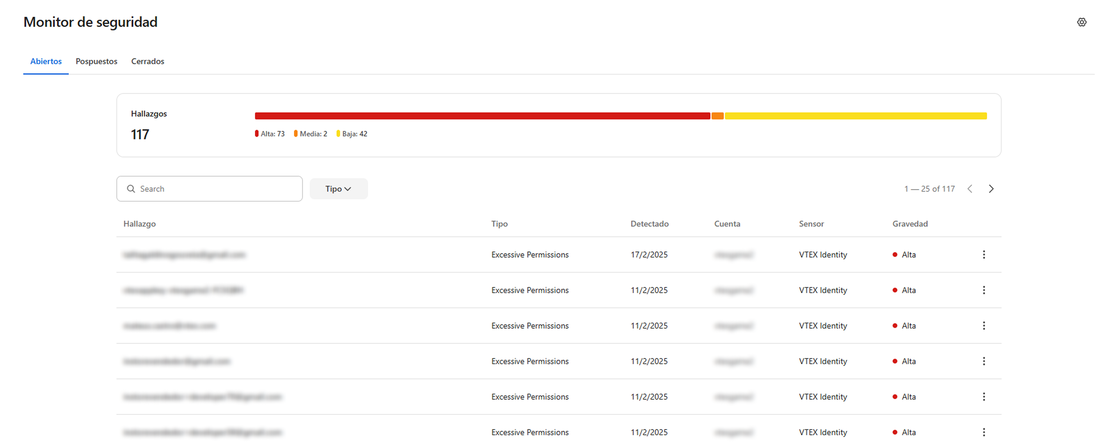 La pestaña muestra la lista completa de hallazgos abiertos en una tabla, del más reciente al más antiguo: