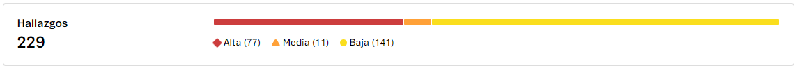 La barra superior muestra el número total de hallazgos y el número de amenazas por nivel de gravedad (alto, medio o bajo).