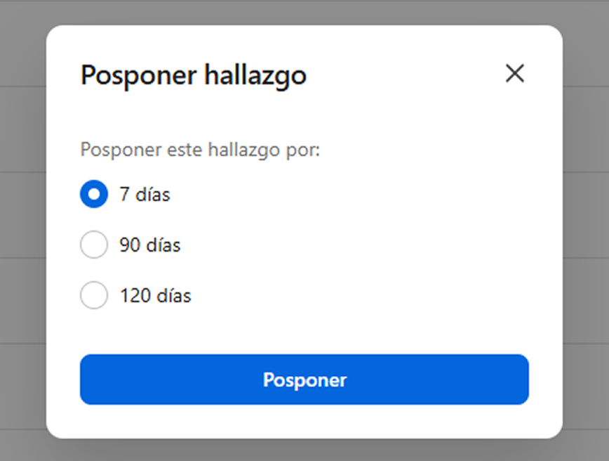 3. Elige el periodo de tiempo, en días, durante el cual deseas mantener este hallazgo en la pestaña Pospuestos. Las opciones disponibles son: 7, 90 o 120 días.