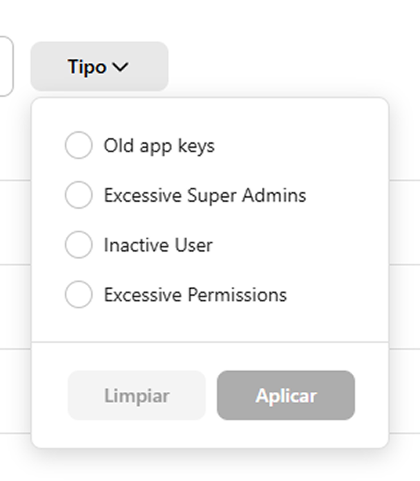 • Excesivos Admin Super: usuarios o claves de API con el rol Owner (Admin Super).