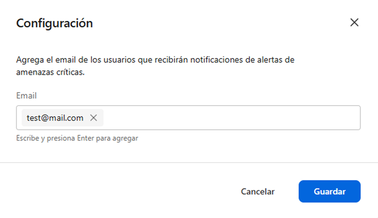 2. Ingresa el email del usuario a notificar y pulsa Enter. Repite este paso para agregar tantos usuarios como sea necesario.