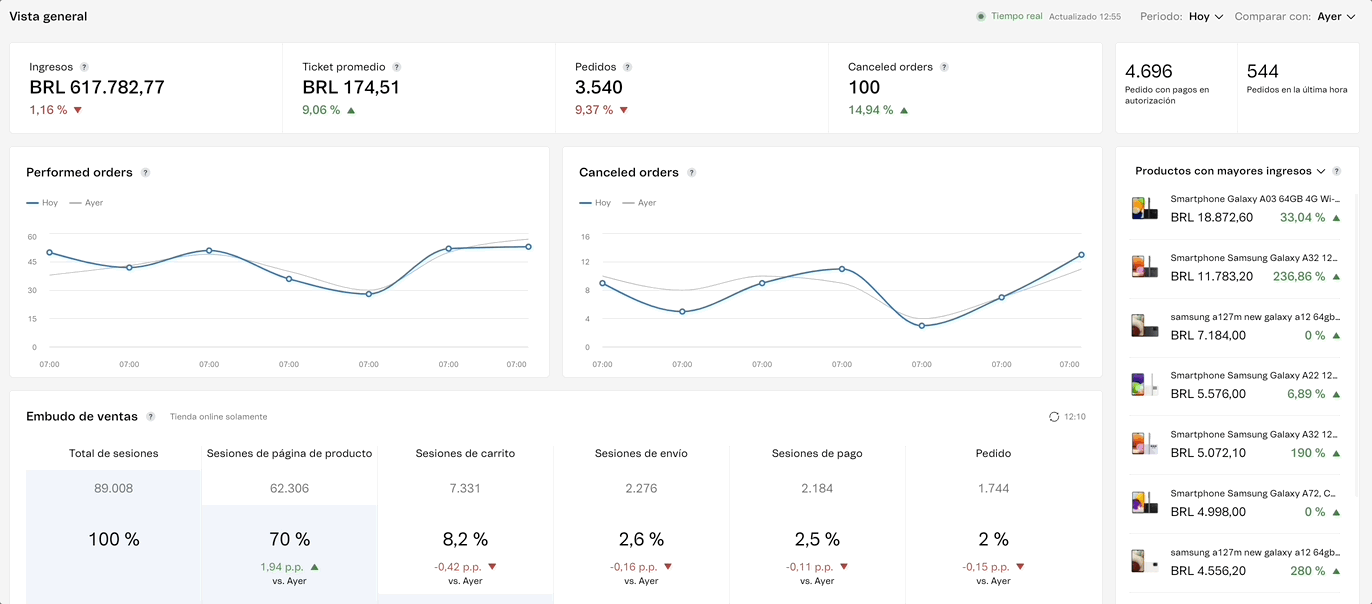 | Con datos de navegación parciales | Pedidos realizados Pedidos cancelados Embudo de ventas Sesiones |