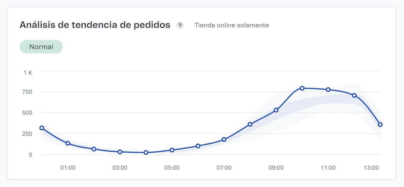 El número que aparece en la parte superior del gráfico se refiere a los pedidos realizados en la última hora y se actualiza cada cinco minutos. La etiqueta que aparece en la parte superior del gráfico indica si los pedidos se están realizando a un ritmo normal, bajo o alto en comparación con el desempeño habitual de tu tienda para ese periodo.