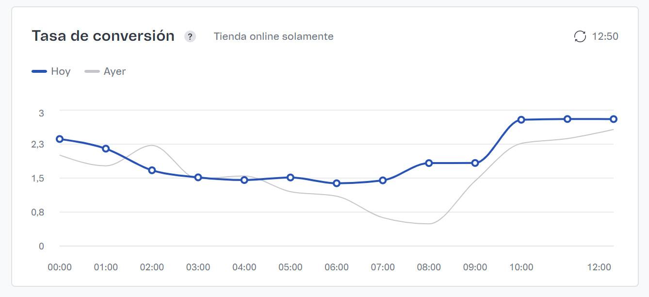 Este gráfico muestra la tasa de conversión de tu tienda en los períodos seleccionados que quieres comparar. La tasa de conversión se calcula dividiendo el número total de pedidos por el número total de sesiones en tu tienda. La línea azul más gruesa indica la tasa de conversión para el periodo más reciente. La línea gris más delgada indica la tasa para el periodo que estás comparando. Al pasar el mouse por encima del gráfico, se visualiza la tasa de conversión para cada periodo comparado. El gráfico también indica el porcentaje (%) y los puntos porcentuales (p.p) de aumento o reducción de esta métrica. Al pasar el mouse por encima del gráfico, puedes ver el valor de esa métrica en momentos específicos.