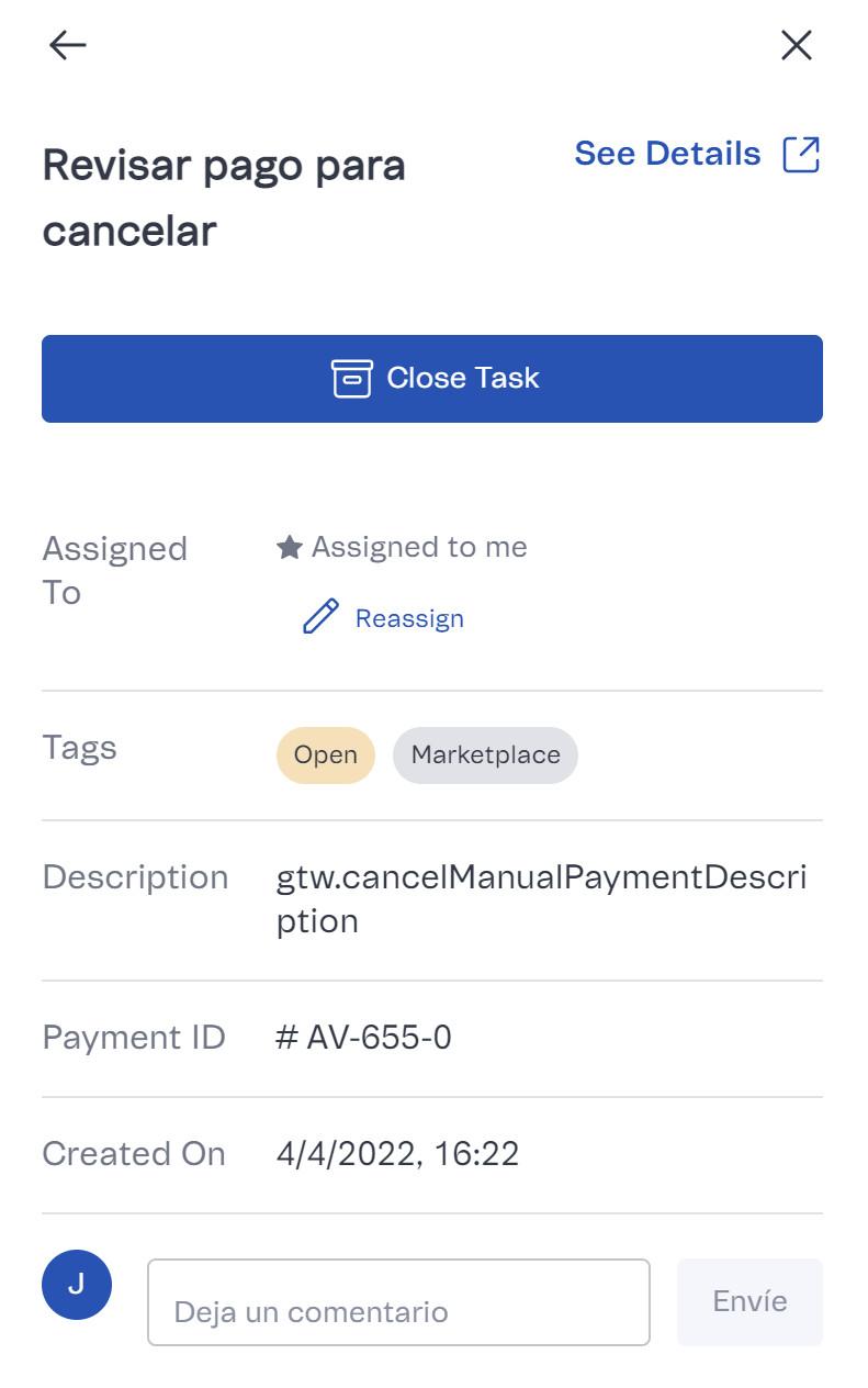 • ID de pago/ID de pedido: si la tarea está relacionada a un pedido, el campo mostrará el ID del pedido. Por otro lado, si está relacionada a un pago, el campo mostrará el ID del pago.