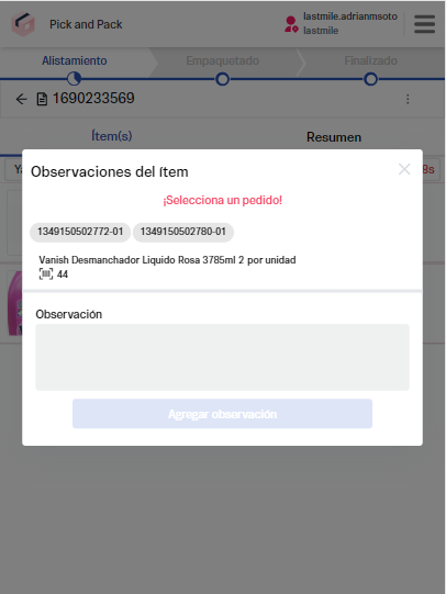Si existen pedidos que comparten producto, selecciona el pedido al que debe asociarse la observación. Ingresa la observación y toca la opción Agregar observación.